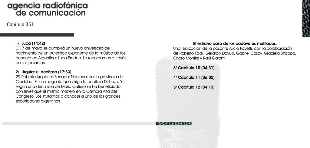 Una realización de la pasante Alicia Pavetti, con la colaboración de Roberto Fadil, Gerardo Dayub, Gabriel Cosoy, Graciela Strappa, Charo Montiel y Raúl Galanti.