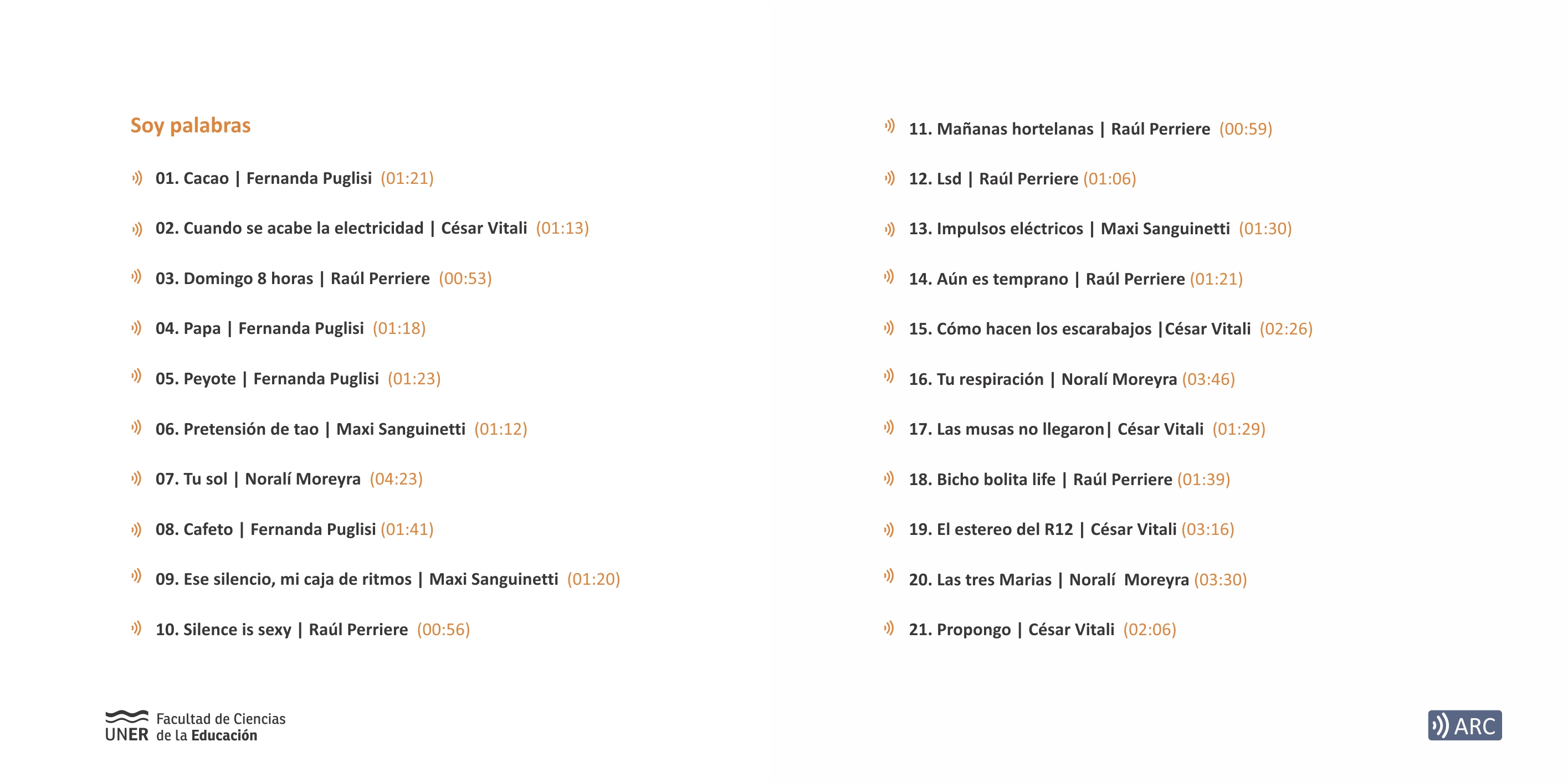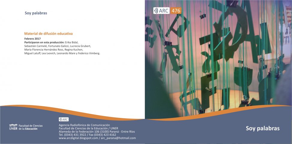César Vitali, Noralí Moreyra, Raúl Perriere, Fernanda Puglisi y Maxi Sanguinetti le ponen voz al arte que antes han plasmado en el papel. Sus poemas y cuentos, publicados por Abrazo Ediciones de la ciudad de Paraná, conforman esta selección de textos radiofonizados al que llamamos Soy palabras.