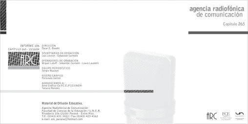 Ariel Levatti: Profesor del Taller de Especialización II (Audio) Guillermo Alfireri: Periodista. Profesor de la FCE/UNER Laura Lavatelli: Operadora Técnica del Laboratorio de Audio del Centro de Producción…