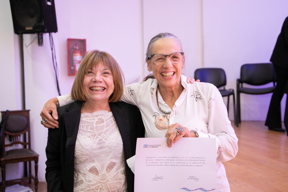 La instancia más emotiva del acto incluyó un reconocimiento a docentes que transitaron por la Facultad de Ciencias de la Educación en las últimas cuatro décadas y que han contribuido a la formación de diferentes generaciones en nuestra región. La profesora Susana Celman, referente del campo de la Evaluación Educativa en el país, fue homenajeada “por el compromiso y la generosidad en la formación de equipos de trabajo, por su apuesta al cuidado de la universidad pública argentina como un espacio colectivo de formación y construcción social del conocimiento”, destacó la gestión.