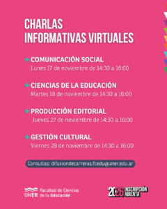 Con la participación de coordinadores, estudiantes de nivel avanzado y egresados y egresadas, del 17 al 28 de noviembre se realizarán charlas abiertas sobre las carreras de Comunicación Social, Ciencias de la Educación, Gestión Cultural y Producción Editorial.