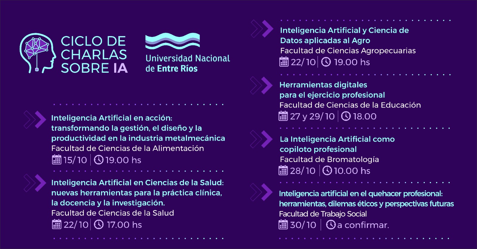 La Universidad Nacional de Entre Ríos invita a su comunidad de graduados y graduadas a participar del ciclo de charlas sobre Inteligencia Artificial y su aplicación en el ejercicio profesional. Esta iniciativa, organizada desde el Rectorado en articulación con las distintas Facultades, busca promover la actualización y el desarrollo profesional continuo en el marco de las transformaciones tecnológicas contemporáneas.