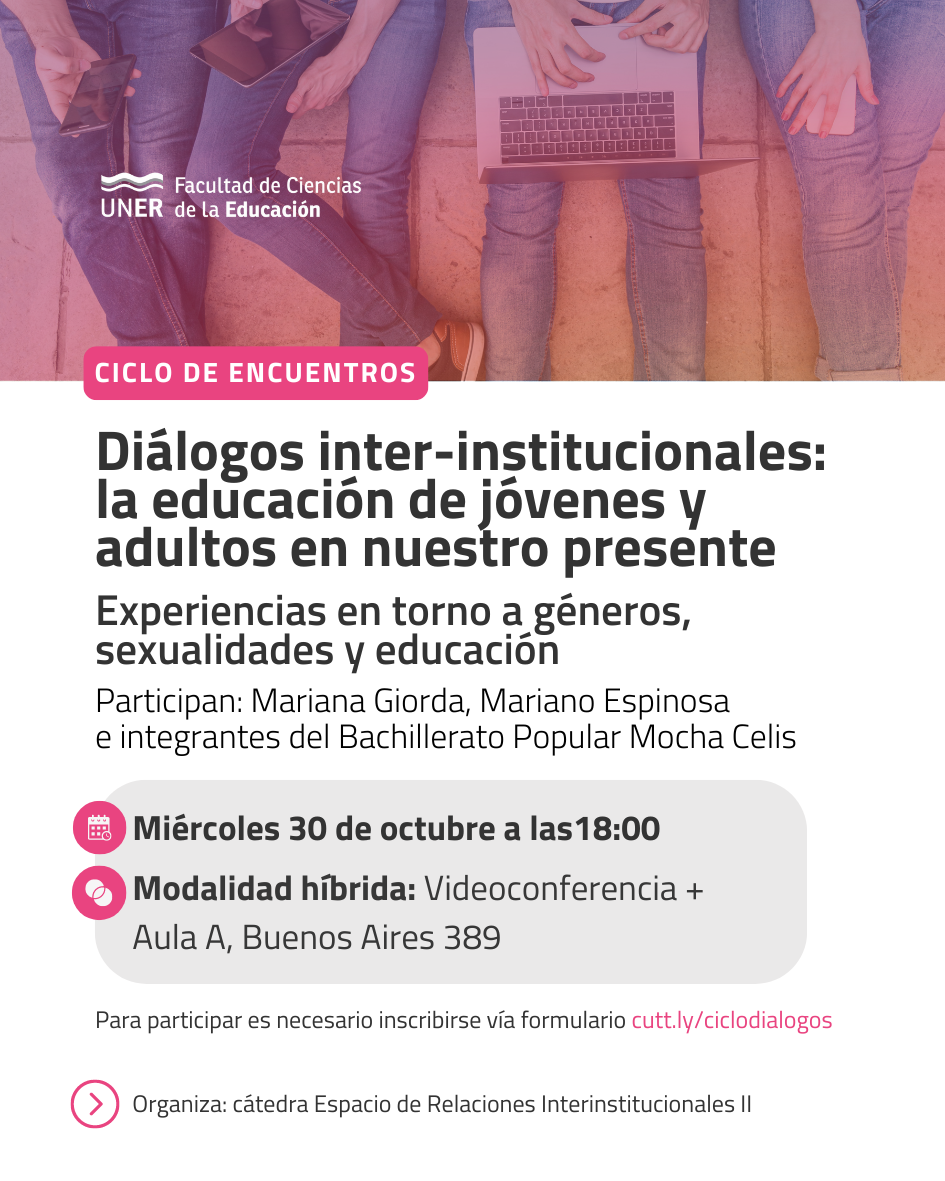 La cátedra Espacio de Relaciones Interinstitucionales II invita a participar de la propuesta del ciclo de Encuentros Diálogos inter-institucionales: la educación de jóvenes y adultos en nuestro presente. Se realizarán dos encuentros el 16 y 30 de octubre, en modalidad híbrida: presencial en el Aula A, Buenos Aires 389, y con transmisión por YouTube. Cada jornada abordará una temática específica.