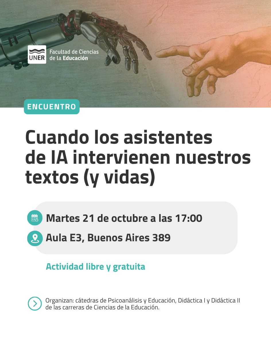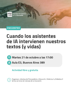 ¿Cómo cambia nuestra relación con el conocimiento cuando las palabras que escribimos y leemos comienzan a estar mediadas por asistencias maquínicas? Esta y otras preguntas guiarán el encuentro Cuando los asistentes de IA intervienen nuestros textos (y vidas), que se realizará el martes 21 de octubre a las 17:00 en el aula E3, Buenos Aires 389.