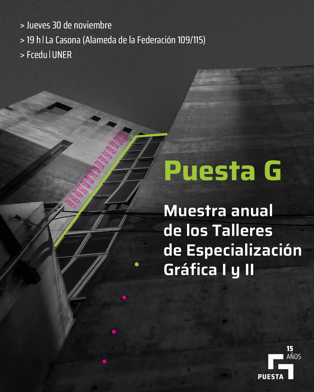 Puesta G es la muestra anual de los trabajos de estudiantes de los Talleres de especialización I y II: Gráfica que realizan durante su paso por la materia.