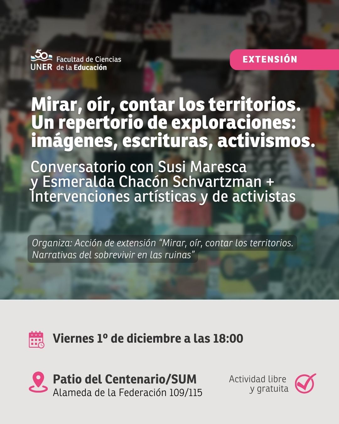 En el marco de la Acción de Extensión “Mirar, oír, contar los territorios. Narrativas del sobrevivir en las ruinas”. Habrá intervenciones artísticas y de activistas y un conversatorio con las fotógrafas Susi Maresca y Esmeralda Chacón Schvartzman. Será el 1º de diciembre de 18:00 a 21:30 en el Patio del Centenario y el SUM.