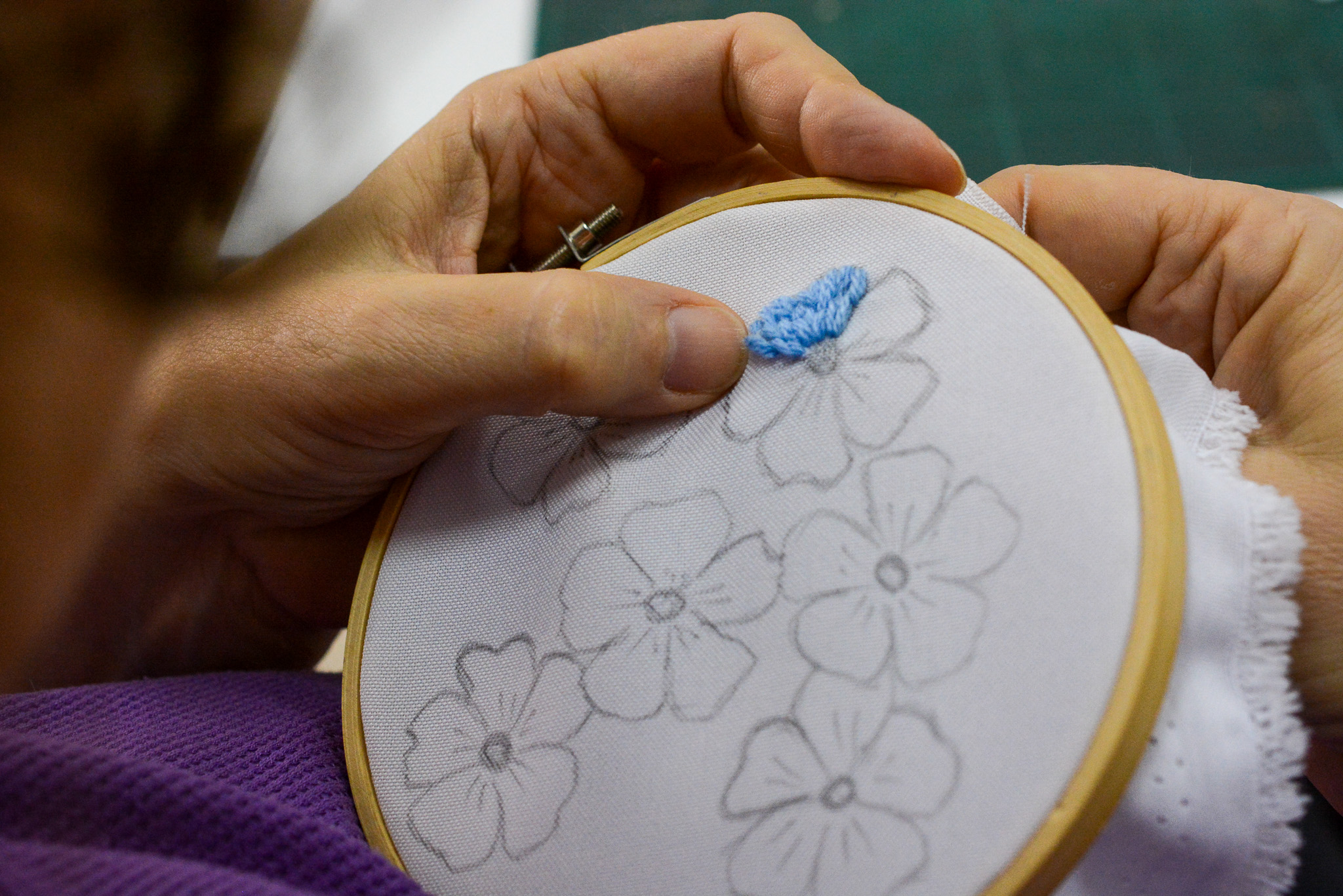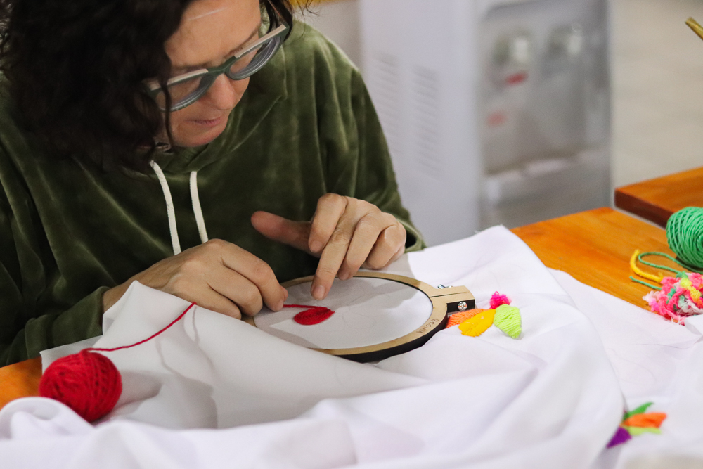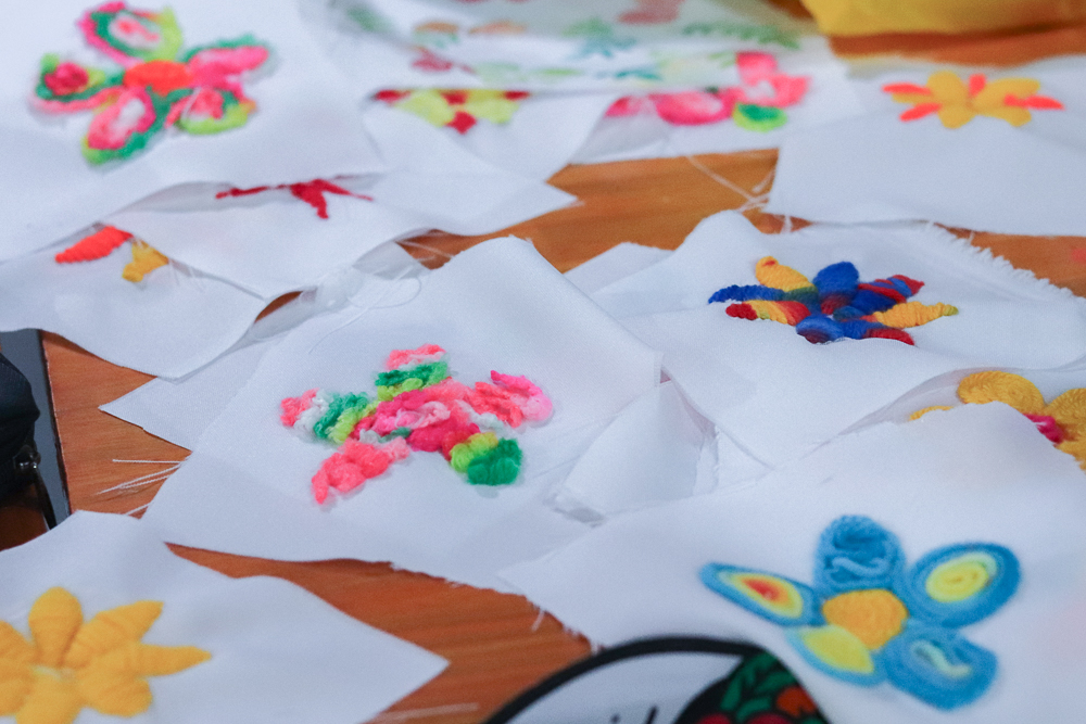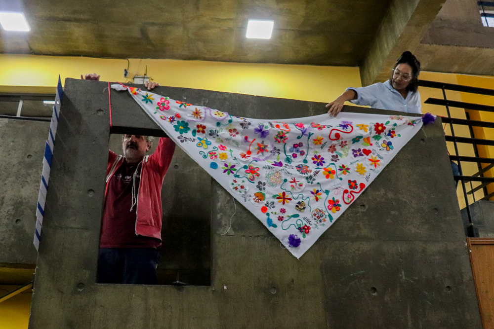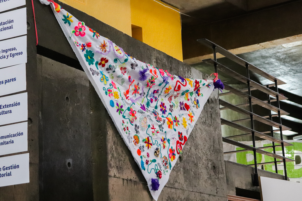 Además, se exhibió un pañuelo con bordados realizados de manera colectiva por el Área Gráfica junto a integrantes de la comunidad académica de la FCEDU.