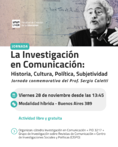 Bajo el título La Investigación en Comunicación: Historia, Cultura, Política, Subjetividad, el encuentro se realizará el viernes 28 de noviembre a partir de las 13:45, en modalidad híbrida: presencial en Buenos Aires 389 y por videoconferencia.