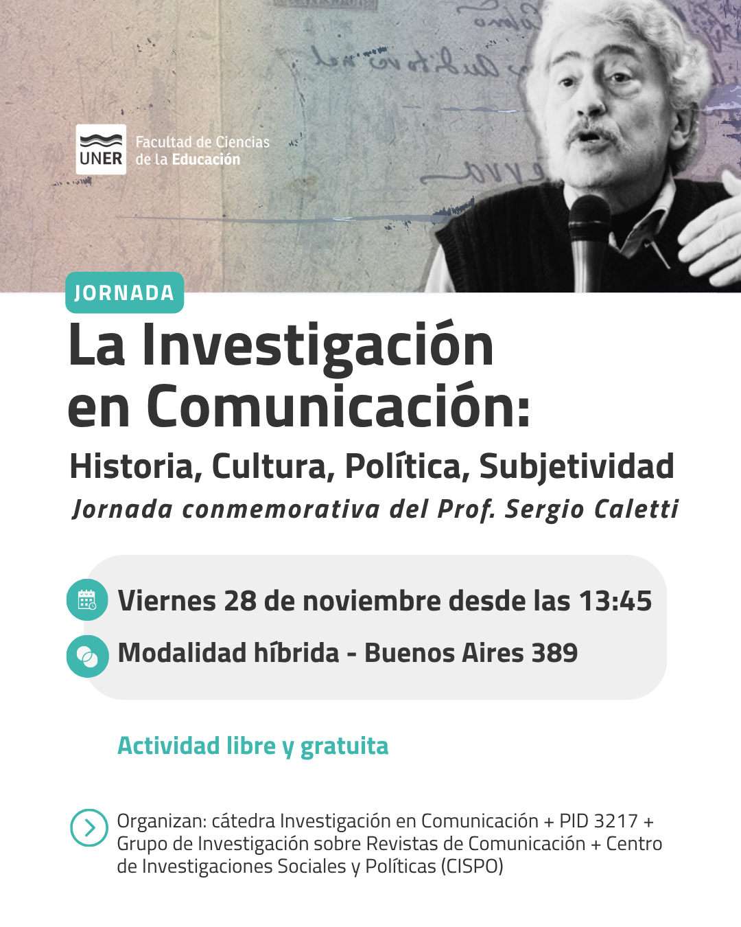 La cátedra Investigación en Comunicación, el PID 3217, el Grupo de Estudios sobre Revistas de Comunicación y el Centro de Investigaciones Sociales y Políticas (CISPO) invitan a participar de una jornada conmemorativa dedicada al profesor Sergio Caletti, en el marco del décimo aniversario de su fallecimiento.