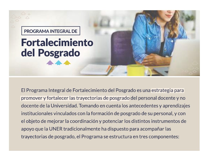 Mediante iniciativa de la Secretaría Académica se aprobó la creación del Programa Integral de Fortalecimiento del Posgrado de la Universidad Nacional de Entre Ríos (Ord. 501/23). A través de este Programa, la UNER consolida el compromiso institucional con la formación de sus trabajadores docentes y no docentes, para contribuir a la mejora integral de las funciones universitarias.