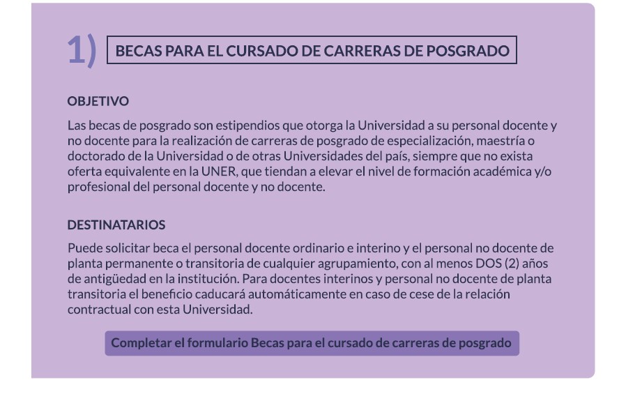 Las becas son estipendios destinados al personal docente y no docente para la realización de carreras de posgrado de especialización, maestría o doctorado de nuestra Universidad o de otras universidades del país (siempre que no exista oferta equivalente en la UNER) que tiendan a elevar el nivel de formación académica y/o profesional. Pueden ser iniciales o de renovación.