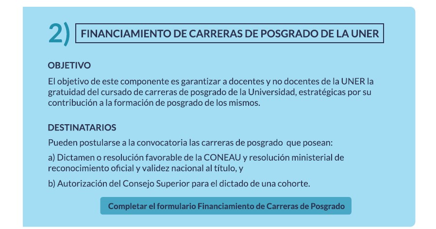 En segundo lugar, el componente del financiamiento de carreras de posgrado de la Universidad tiene como objetivo garantizar a docentes y no docentes de la UNER la gratuidad del cursado de carreras de posgrado propias. Alcanza a una carrera de especialización o una maestría por unidad académica; y a la totalidad de los doctorados de la Universidad.