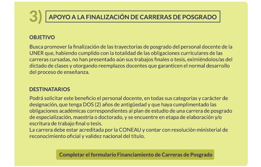 En tercer lugar, el componente de apoyo a la finalización de carreras de posgrado busca acompañar las trayectorias académicas del personal docente de la UNER que, habiendo cumplido con la totalidad de las obligaciones curriculares de las carreras cursadas, no han presentado sus trabajos finales o tesis. Consiste en la eximición del dictado de clases durante cinco meses y el reconocimiento de un monto equivalente a una dedicación simple del cargo que reviste para un/a docente de reemplazo.