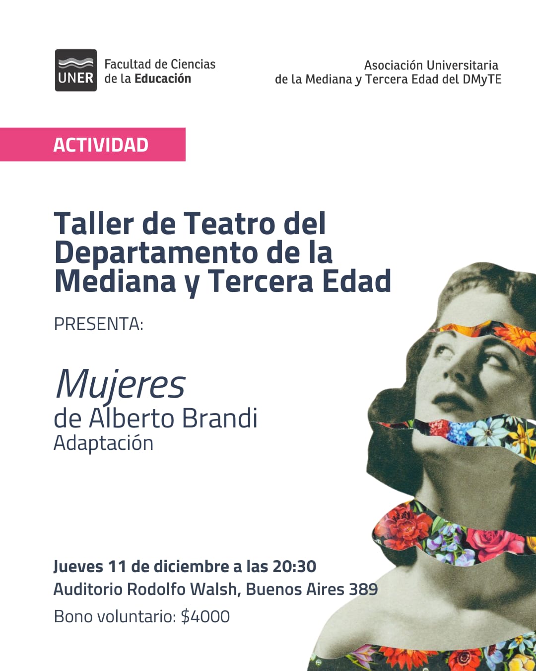 El jueves 11 de diciembre a las 20:30 horas en el Auditorio Rodolfo Walsh (Buenos Aires 389), el Taller de Teatro coordinado por la profesora Rosario “Charo” Montiel presentará «Mujeres» de Alberto Brandi.