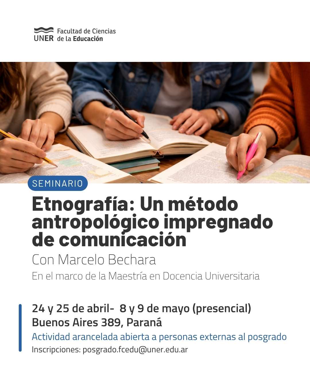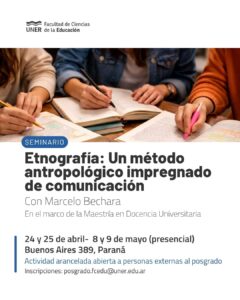 La secretaria de Investigación y Posgrado informa que se encuentra abierta la inscripción para el seminario de postgrado llamado: Etnografía: Un método antropológico impregnado de comunicación, a cargo del magister Marcelo Bechara. El mismo, se dicta en el marco de la carrera: Maestría en Docencia Universitaria, y es una actividad abierta a estudiantes externos de carácter arancelado.