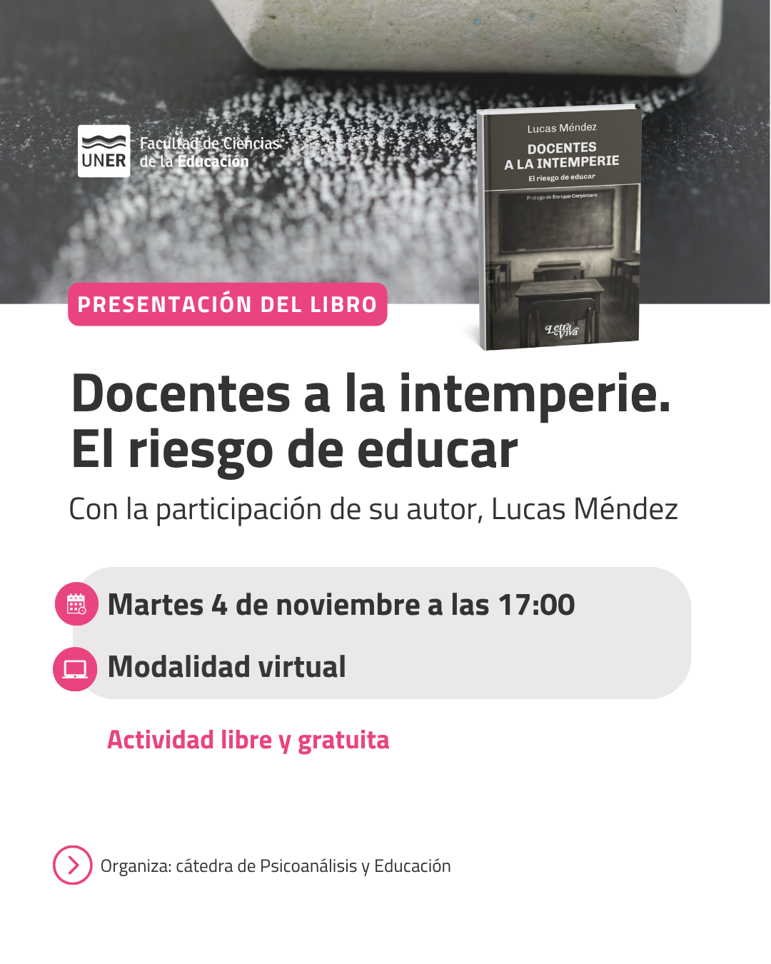 La cátedra de Psicoanálisis y Educación invita a participar de la presentación del libro Docentes a la intemperie. El riesgo de educar (Letra Viva, 2025) del psicoanalista Lucas Méndez, que se realizará el martes 4 de noviembre a las 17:00, en modalidad virtual, a través del siguiente enlace: https://meet.google.com/paz-qone-nbp