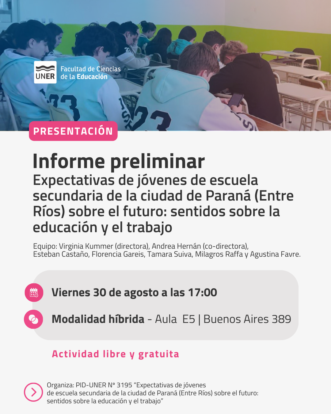 El Proyecto de Investigación y Desarrollo “Expectativas de jóvenes de escuela secundaria de la ciudad de Paraná (Entre Ríos) sobre el futuro: sentidos sobre la educación y el trabajo” presentará un informe preliminar a las escuelas participantes de la muestra.