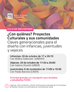 En el marco de los proyectos de innovación e incentivo a la docencia que se desarrollan en nuestra facultad, se llevará a cabo el Ciclo de Encuentros: ¿Con quiénes? Proyectos Culturales y sus comunidades. Claves generacionales para el diseño con infancias, juventudes y vejeces, organizado por el Taller de Diseño y Gestión de Proyectos Culturales de la Tecnicatura en Gestión Cultural y la Licenciatura en Comunicación Social. La propuesta contará con referentes en el trabajo con estas poblaciones y tendrá lugar el 20 y 29 de octubre y el 6 de noviembre.