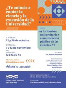 Con ese propósito, se desarrollará el taller Extensión Universitaria y Comunicación Pública de las Ciencias, a cargo del doctor Andrés Wursten. La propuesta está destinada a extensionistas, investigadores/as y estudiantes de la comunidad UNER, y se dictará en modalidad virtual sincrónica, con participación no arancelada.
